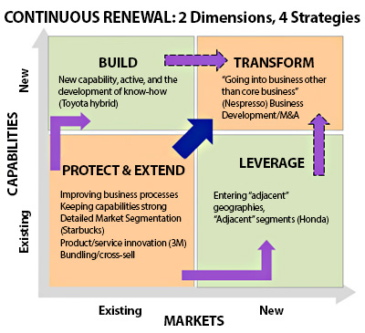 In a nutshell, the formula of continuous renewal is as follows: You invest in new capabilities and markets using your existing business advantages, and you do it for the long term (10+ years), on a continuous basis. Hard it is indeed, but not impossible.