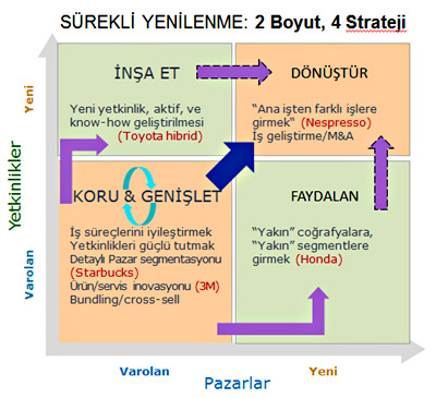 Özetle sürekli yenilenmenin formülü şu: Mevcut iş avantajlarınızı kullanıp yeni yetkinlik ve pazarlara yatırım yapacaksınız, bunu da uzun vadede