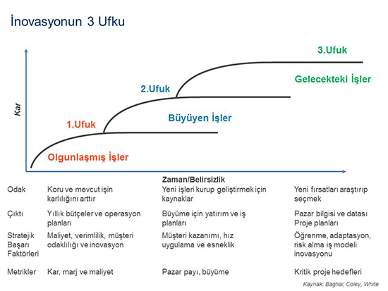 - İnovasyon haritası: Her şeyden önce mevcut inovasyon çalışmalarımızın hayata geçme vadesine (kısa/orta/uzun) ve mevcut iş modelimize yakınlığına bakarak, inovasyon haritamızı çıkartmamız gerekiyor. Daha sonra bu haritayı mevcut/yeni ve hızlı büyüyecek/gelecekte şekillenecek işler olarak 3 ufka ayırmak... (Bakınız aşağıdaki şablon). Eğer çalışmalarımızın çoğu mevcut işin etrafındaysa, buralarda açık inovasyonun etkisi nispeten az. Açık inovasyonun esas etki alanı, yeni ve gelecek işler olarak konumlanıyor. Kısaca yeni ve gelecek işlerde iddiamızı arttırıyorsak, açık inovasyon ideal çözüm.